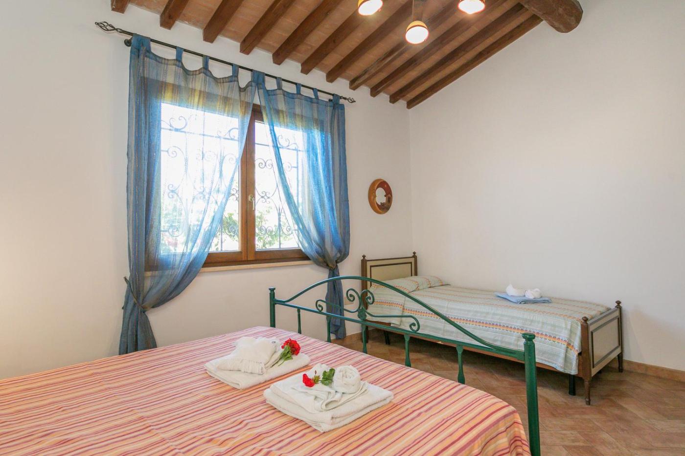 Questo agriturismo comprende 2 camere da letto, 1 bagno, lenzuola, asciugamani, una TV, una cucina con utensili e un patio con la vista sul giardino.