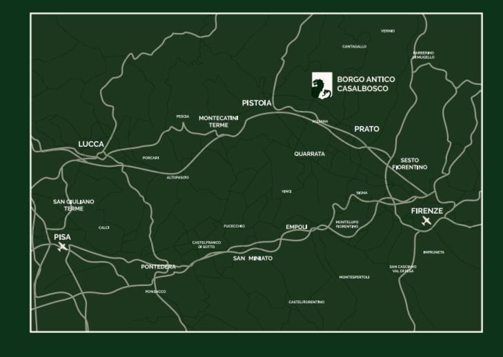 La Fattoria Casalbosco sorge a soli 1,5 km dal centro di Santomato, a 15 minuti dauto dalla stazione ferroviaria di Pistoia e a circa 22 km dagli impianti termali di Montecatini Terme.